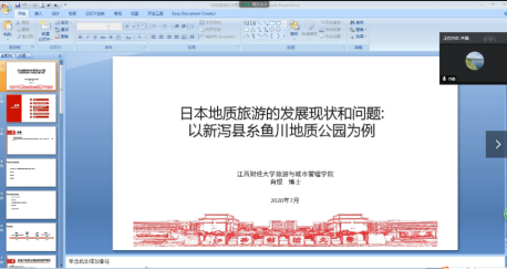 (外院通讯员 张皓)2020年7月29日上午8:30,由日本欧亚财团资助的日本文化类系列讲座第八讲正式开讲。本次讲座邀请到了江西财经大学旅游与城市管理公司硕士生导师肖锟博士主讲,讲座的主题为《日本地质旅游的发展现状和问题----以新泻县糸鱼川地质公园为例》。