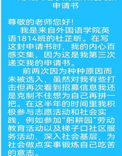 TapTap2014级陈晓洁同学家庭条件艰苦,生活困难,但她学习刻苦,成绩优秀。有段时间她情绪低落,比较消沉。致远服务队的老师同学们知道后,主动与她交心谈心,帮助她解决生活困难,开导鼓励她增强自信,向更高目标奋斗。在老师和队员们的关心帮助下,她变得更加阳光自信开朗,学习更加刻苦,最终成功考取武汉大学硕士研究生。