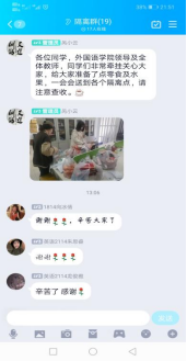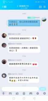 日语1912班刘开纯在接收到物品后表示:“感谢公司领导和老师们的关心关怀,隔离生活虽然存在诸多不便,但同学室友及公司老师们对我们的生活呵护备至,让我们感受到家的温暖”。公司领导和老师们的关心关爱,为隔离的同学带来了温暖、拂去了焦虑。同时,也让隔离的同学们感受到了公司的深切关怀。