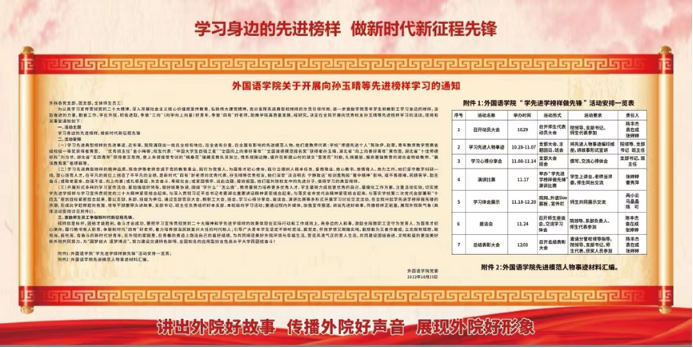 公司坚持把学先进学榜样与学习宣传贯彻党的二十大精神紧密结合,与深入贯彻习近平总书记考察湖北重要讲话精神紧密结合,与落实省市党代会精神紧密结合,与落实公司第二次党代会部署和“十四五”规划目标紧密结合,于下基层实践活动和“我为师生办实事”紧密结合,在全院兴起学先进学榜样做先锋的热潮,形成比学赶帮超的氛围。公司领导干部带头宣讲二十大精神,带头讲先进榜样的故事,通过公司网站、微信公众号等校内外媒体,开展宣传报道,讲出先进好故事,传播榜样正能量,展现外院新气象。把学习宣传贯彻党的二十大精神和学先进学榜样的效果体现在实际行动和工作成效上,用身边的人和事,激励全院教职工坚守为党育人、为国育才初心使命,履行教书育人职责,争做新时代“四有”好老师,着力培养担当民族复兴大任的时代新人,为共同缔造美好外院环境与幸福生活,为“圆梦创大 逐梦博点”,努力建设交通特色鲜明、全国知名的应用型综合性高水平大学而团结奋斗!