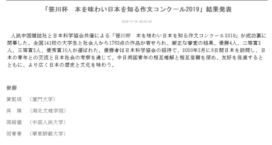 笹川杯征文大赛经中华人民共和国外交部批复,为中日两国政府认可的“中日青少年交流促进年”系列活动之一,至今已成功举办十一届。本届比赛共收到来自全国141所高校共计1763份作品。比赛共评出一等奖4名,二等奖2名,三等奖2名,优秀奖10名。获奖选手分别来自中国人民大学、厦门大学、华东师范大学等国内知名高校。吴婵同学能从竞争激烈的比拼中脱颖而出,获得第一名的好成绩,既是其个人和指导老师共同努力的成果,也是外院日语专业教学高质量发展的体现。