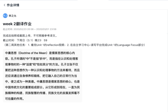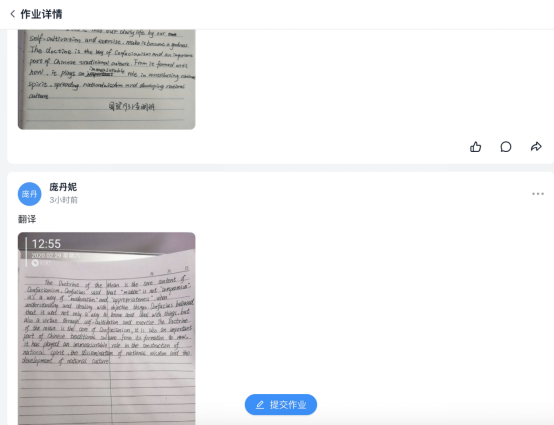 “圈子”是钉钉推出时间不长的功能,对于高校教学来说,最方便的是“作业”功能。对大学英语教师来说,布置翻译和写作类作业的必需的。钉钉的“作业”功能可以让员工方便地上传图片、文档或文字,自动统计提交情况,教师可以点赞、转发、评论,也可以选择优秀作业进行展示,对于英语主观题目来说是一个较为理想的提交途径。