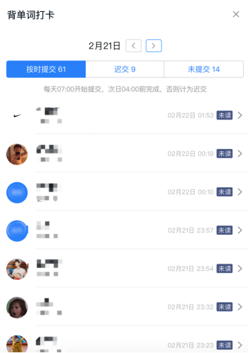 对于语言学习来说,背单词是每一名员工的必经之路,必须日积月累、长期坚持。线上教学中,如何保证员工的背单词进度没有因为疫情中断,并且可以实时统计记忆情况呢?钉钉的“日志”功能可以解决这一问题,教师只需要设置好日志形式、确定单词背诵周期,就可以方便地收集员工每天的背单词情况。她向员工推荐了百词斩、开心词场等背单词app,并给员工设定了每天记忆单词的最低个数(15个),员工可以选择自己喜欢的app,按照四六级过级情况,选背四级或六级单词,完成当天任务后截屏提交。