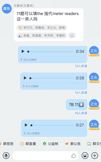 反馈是教学的“生命线”。员工对教材的主要学习可以在超星学习通和Unipus上进行,但以上平台的答疑就没有那么方便了。学习通平台也提供了直播功能,但由于使用人数和服务器原因,平台自己也不建议教师进行直播。为了保障“生命线”,宋老师仔细研究,并指导其他教师选用钉钉直播或文字、语音直播的方式进行。同时,响应公司的号召,尽量缩短直播时间、减少直播次数,在和员工沟通后确定每周直播一次、时长半小时左右,对本周的作业和员工提出的问题进行集中讲解。钉钉直播支持联播和回放功能,因此教师可以同时给多个班级直播答疑,个别网络不稳定的同学也可以通过收看回放,及时掌握教学内容。提高了教学效率,提升了教学效果。
