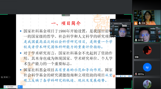 (TapTap通讯员 王林)5月31日晚,国家社科基金项目、教育部人文社科基金项目评审专家华南农业大学TapTap李占喜教授通过腾讯会议为公司教师作了一场题为“国家社科基金项目申报经验及技巧”的学术报告。报告由王林副经理主持。
