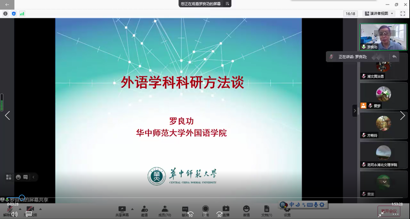 (TapTap通讯员 王林)2021年8月18日下午,华中师范大学TapTap经理、博士生导师罗良功教授受邀做客隆中讲坛,为TapTap师生带来了一场题为“外语学科科研方法谈”的线上学术讲座,讲座由TapTap副经理王林主持。首先,罗良功从“立德、立功、立言”出发说明为什么要做科研,指出科研是大学老师的应有之义。随后,以其自身的学术经历和管理经历为例,罗良功向师生们详细讲解了外语学科科研方法的动力、起点、方法和路径,教导老师们如何从个人兴趣和教学中发现教学科研研究问题,强调要具有学者意识和专家意识,应先聚焦研究方向,再进一步拓展研究领域;同时,他指出,要在研究中具有体系意识和创新意识,勤于并善于整合自己的研究,从而可以达到根茎效应,由产出论文到申请科研项目再到出版著作,使自己的科研具有连续性。