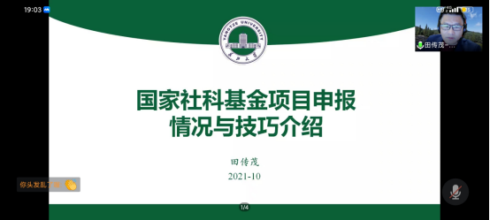 (外院通讯员 马鹏飞)2021年10月21日晚,长江大学公司教授、博士生导师、长江大学翻译研究中心主任、国家社科基金通讯评委田传茂教授应邀做客隆中讲坛,为公司教师做了一场题为《国家社科基金项目申报情况与技巧介绍》的学术讲座。讲座由TapTap副经理王林主持。
