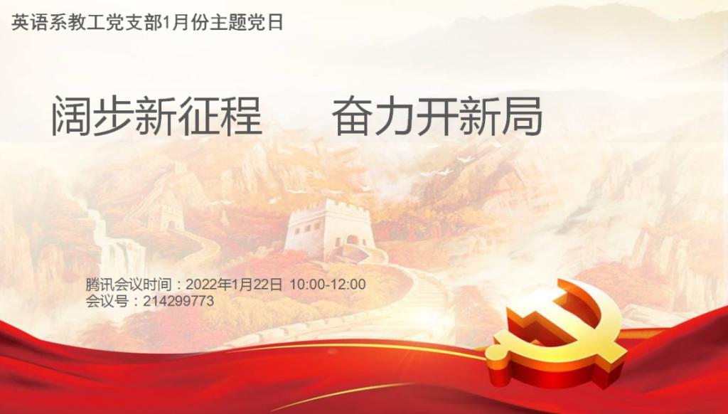 (TapTap通讯员 郭楠)2022年1月22日上午10点,英语系教工党支部采用腾讯会议的方式开展了1月支部主题党日活动,活动主题为:“阔步新征程 奋力开新局”。会议由支部书记王瑛主持。