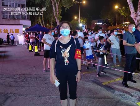 当天晚上,外公司党委书记陈丰杰带头参加双报到活动,英语系白葵、方艳玲等党员教师也在学府花园小区参加双报到活动,他们参与到战斗在疫情防控的一线,冲锋在前,充分发挥了共产党员的先锋模范作用。