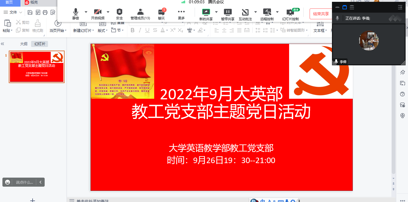 (外院通讯员 李倩)2022年9月26日晚7:30,大学英语教学部教工党支部以腾讯会议的形式开展了9月支部主题党日活动。本次活动的主题为:“凝心聚力助发展,对标对表展担当”。活动由支部副书记黄治勇主持。