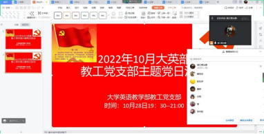 (外院通讯员李倩)2022年10月28日晚7:30,大学英语教学部教工党支部通过腾讯会议在线上开展了10月支部主题党日活动。本次活动的主题为:“学习贯彻党的二十大、奋发有为担使命”。活动由支部副书记黄治勇主持。