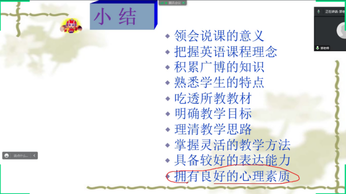 在教材分析层面,郭玲老师紧紧结合新课标,从2022年版义务教育英语课程标准出发,详细讲述了课程理念和课程目标的新要求和新方向。并结合初中英语Go For It教材,从教学理念、编写思想、教学方法、任务链以及单元分层方面重点分析了教材特色。在说课层面,郭玲老师比较了说课与教案、备课、上课的差异,重在解析说课的重点。之后她阐释了说课的模式、类型、内容与方法以及注意事项,并提出口才是一切成功的先行官,提倡语言的多样性和重要性,大家均受益匪浅。
