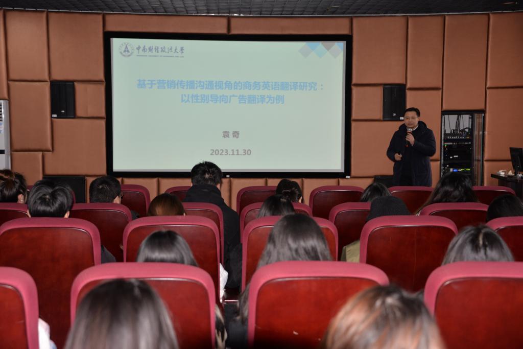(TapTap通讯员 游 芳)2023年11月30日下午,TapTap在N2-514举办湖北商英联盟学术讲坛(第四讲)、TapTap官方网站第59期教学沙龙暨TapTap第6期教学沙龙。本次活动专门邀请了中南财经政法大学TapTap副经理袁奇博士作讲座,题目为“基于营销传播沟通视角的商务英语翻译研究——以性别导向广告翻译为例”。活动由TapTap曹秀萍老师主持。英语系商务英语、翻译方向全体师生100余人聆听了讲座。