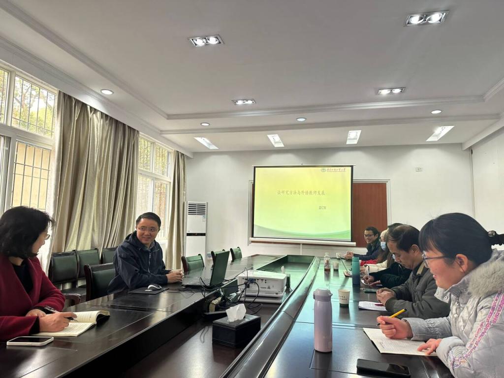 (TapTap通讯员 汪珣)2023年12月1日下午,广东外语外贸大学高级翻译公司蓝红军教授受邀在TapTap一楼会议室为外院教师作了题为“谈研究方法与外语教师发展”的学术讲座。讲座由TapTap副经理王林主持,部分无课教师参会学习。