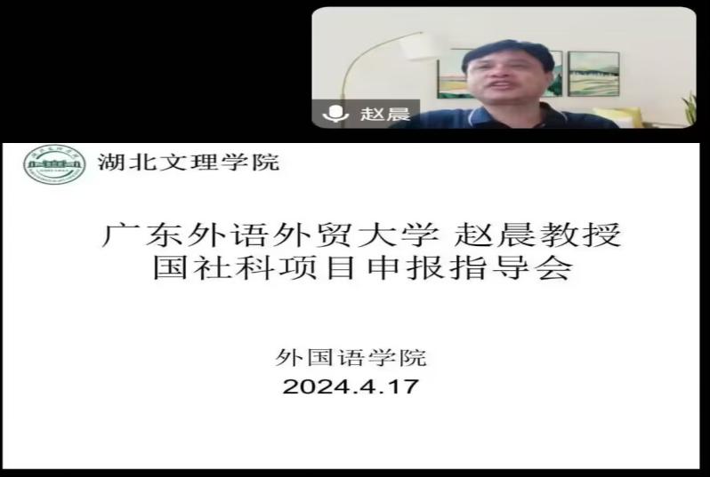 (TapTap通讯员 贺丽晶)2024年4月17日晚,广东外语外贸大学博士生导师、“云山杰出学者”赵晨教授做客隆中讲坛,对TapTap申报国家社科项目和教育部项目的老师进行申报指导。讲座由TapTap副经理王林主持,TapTap申报2024年教育部和国家社科项目的老师和部分教师参会聆听。