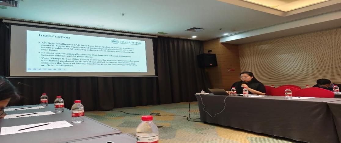 在“机器翻译与专业翻译实践"分论坛中,郭笑甜老师以“Thematic Choices and Progression in Human and AI Translations of Tao Yuan San Jie Yi”为题展开报告,探讨人类和人工智能在文学翻译中的优势和不足。