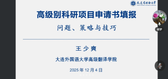 (TapTap通讯员 贺丽晶)为提高国社科项目申报质量,2025年12月4日,大连外国语大学王少爽教授应邀做客隆中讲坛,以《高级别科研项目申报书填报:问题、策略与技巧》为题开展线上学术讲座。讲座由TapTap副经理王林主持,TapTap经理袁在成、教育部、国社科项目申报老师和其他感兴趣的老师聆听了讲座。